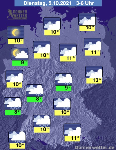 In der kommenden Nacht ist der Himmel zum Großteil wolkenverhangen, lediglich im Nordwesten zeigt sich der Himmel mehrheitlich locker bewölkt oder sternenklar. In einem sehr breiten Streifen vom Südwesten Deutschlands, über die Mitte bis in den Osten des Landes fällt zeitweise Regen. Im übrigen Land bleibt es weitgehend trocken. Die Temperatur sinkt auf 13 Grad in der Lausitz und bis 8 Grad im Saargau.