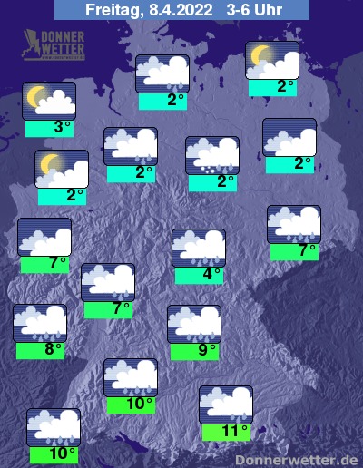 In der Nacht zum Freitag lockert es im Norden gebietsweise auf, teils ist es hier aber auch stark bewölkt und es bilden sich einzelne Regen- oder Schneeschauer. Im übrigen Land fällt unter dichten Wolken zeitweise Regen. Die Temperatur sinkt auf 11 Grad in München und etwa 2 Grad in Berlin. Im Norden und Osten ist es verbreitet stürmisch, an der See und auf den Bergen herrscht vielerorts Sturm. Über der Südwesthälfte des Landes ist es dagegen deutlich ruhiger.