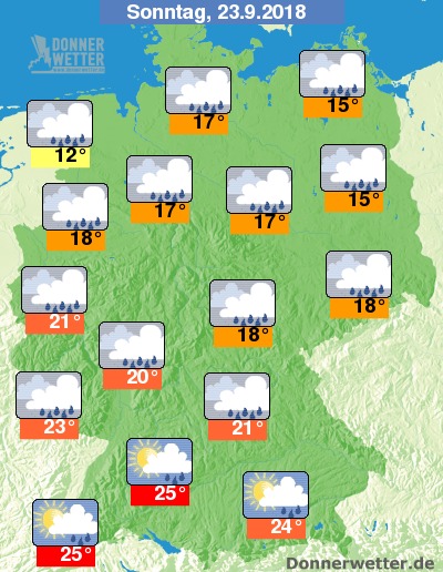 Am Sonntag halten sich verbreitet dichte Wolken, dabei fällt vor allem über der Nordhälfte immer wieder, zum Teil auch kräftiger und gewittriger Regen. Im Süden ist es zum Teil heiter, teils ziehen auch hier dichte Wolken durch und es können sich gebietsweise Schauer und seltene Gewitter bilden. Die Temperatur steigt auf 12 Grad direkt an der Nordsee und bis 25 Grad im Oberrheingraben.