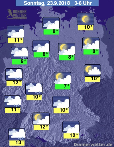 In der Nacht zum Sonntag ist es über der Südwesthälfte meist stark bewölkt, aber zunächst trocken. Über dem Norden und Osten ist es zunächst nur locker bewölkt, gegen Morgen nimmt hier die Bewölkung zu, dazu bleibt es hier trocken. Über der Südwesthälfte setzt jedoch im Laufe der zweiten Nachthälfte Regen ein. Die Temperatur sinkt auf 13 Grad im Breisgau und bis 7 Grad im Thüringer Becken. An der Ostsee weht weiterhin ein teils stürmischer Wind.