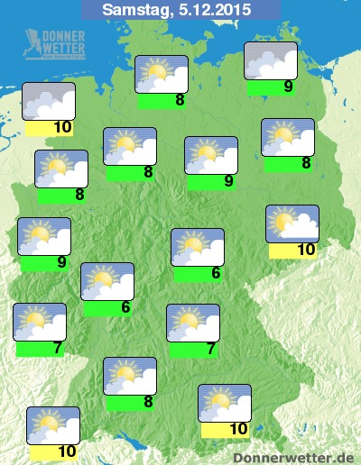 Heute bleiben die Wolken im Norden überwiegend dicht, dabei sind dennoch einzelne Auflockerungen möglich, im großen Rest des Landes gibt es einen Wechsel aus aufgelockerten und teils auch dichten Wolken. Längere Aufheiterungen sind vor allem im Süden möglich, dazu bleibt es bundesweit trocken. Die Temperatur steigt auf 6 Grad am Westerwald und bis auf etwa 10 Grad im Breisgau. Im Umfeld von Nord- und Ostsee herrscht oft Sturm, vor allem an der Nordsee sind dabei auch orkanartige Böen möglich, sonst weht im Norden des Landes ein teils starker und in Böen teils stürmischer Wind.