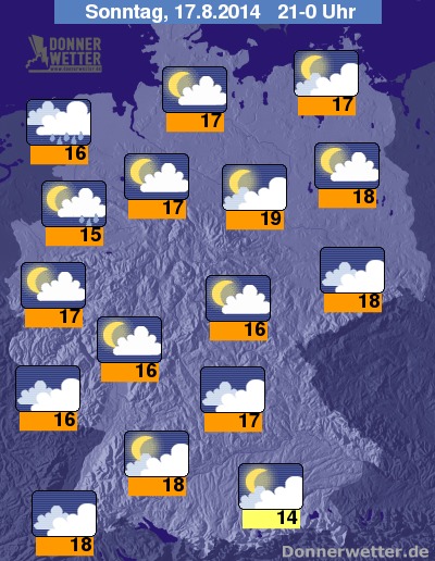 Heute Abend ist es im Nordwesten meist stark bewölkt und es fällt zeitweise Regen, sonst bleibt es bei aufgelockerter, vor allem in der Südhälfte meist geringer Bewölkung vielfach trocken. Die Abendtemperatur liegt bei 18 Grad im Oderbruch und 14 Grad am Mangfallgebirge.