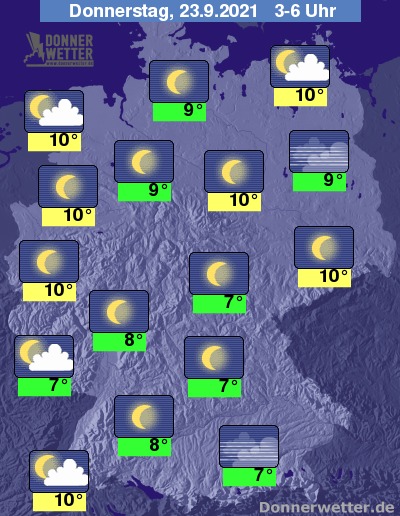 In der Nacht zum Donnerstag zeigt sich der Himmel verbreitet sternenklar, hier und da können auch wenige lockere Wolken durchziehen, dazu bleibt es trocken. Die Temperatur sinkt auf 10 Grad an der Ems und bis 7 Grad an der Donau.