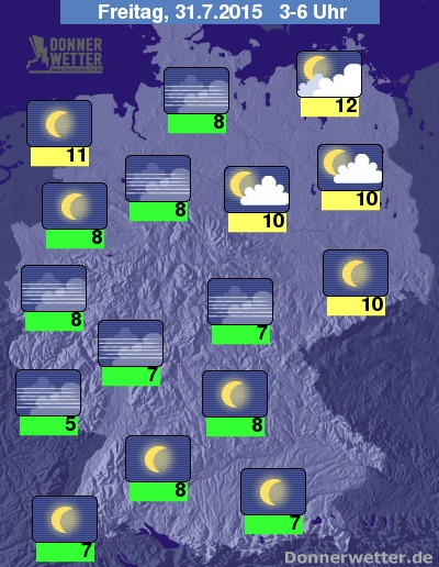 In der Nacht zum Freitag ist es häufig sternenklar, besonders im Osten und Nordosten ziehen auch einige Wolken durch. Hier und da bildet sich Dunst. Es bleibt trocken. Die Temperatur sinkt auf 12 Grad in Rostock und bis 5 Grad am Pfälzer Wald.