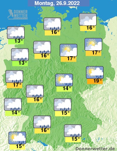 Am Montag ist es über der Südosthälfte Deutschlands zum Teil locker, teils jedoch stark bewölkt, dabei bilden sich gebietsweise Schauer. Im übrigen Bundesgebiet ziehen verbreitet dichte Wolken durch und es fällt gebietsweise Regen. Die Temperatur steigt nur noch auf 13 Grad an der Ems und bis 19 Grad in der Lausitz. An den Küsten weht ein zum Teil stürmischer Wind.