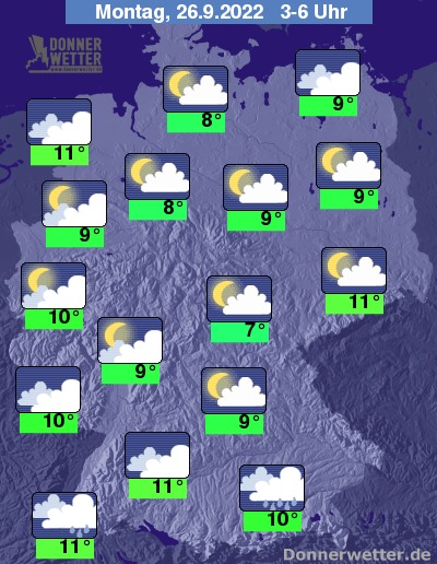 In der folgenden Nacht bleibt es über dem Alpenvorland meist bedeckt bei gelegentlichen Schauern. Im übrigen Land zeigt sich der Himmel zunächst verbreitet nur locker bis wechselnd bewölkt. Im Laufe der zweiten Nachthälfte zieht es sich von Nordwesten her jedoch mehr und mehr zu, dazu bleibt es aber trocken. Die Temperatur sinkt auf 11 Grad in Freiburg und etwa 7 Grad in Erfurt.
