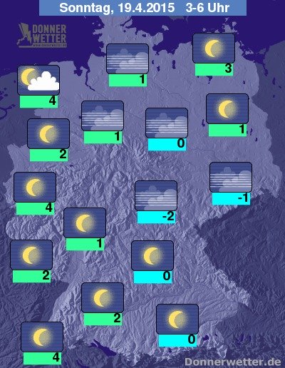 In der Nacht zum Sonntag ist es verbreitet sternenklar, nur im Nordseeumfeld ziehen teils einige Wolken durch, es bleibt überall trocken. Stellenweise bildet sich Nebel oder Dunst. Die Tiefstwerte liegen bei 4 Grad in Freiburg und -2 Grad im Coburger Land.