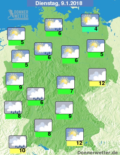 Am Dienstag zieht über die westlichen Landesteilen meist dichte Bewölkung, die hier auch gebietsweise für leichten Regen sorgt. Im übrigen Bundesgebiet ist es teils aufgelockert, zum Teil ist es stark bewölkt, dabei allerdings weitgehend trocken. Die Temperatur steigt auf 4 bis 12 Grad.