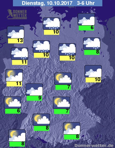 In der folgenden Nacht dichte Wolken über den Norden, bis zum Morgen hin über die gesamte Nordhälfte hinweg und es fällt zeitweise Regen. Über der Südhälfte des Landes bleibt der Himmel hingegen meist locker, hier und da auch mal stärker bewölkt, dabei bleibt es trocken. Die Temperatur sinkt auf 13 Grad an der Nordsee und bis 6 Grad am Pfälzer Wald.