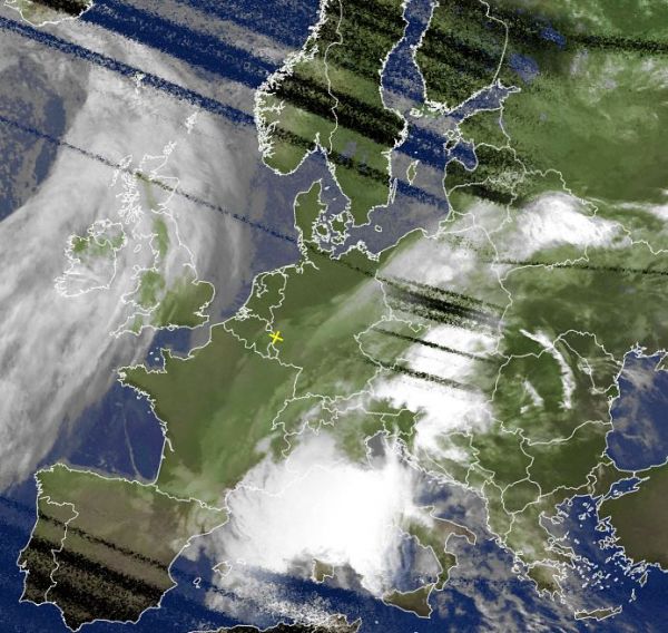Das Satellitenfoto von heute Morgen zeigt weite Teile von Westeuropa wolkenlos. Das Hoch "Leo" mit Kern über Norddeutschland bringt verbreitet freundliches und auch schon recht mildes Wetter. Tief "Kerstin" mit Zentrum über dem nördlichen Mittelmeer sorgt dagegen für vielerorts sehr kräftigen Regen in diesen Regionen.