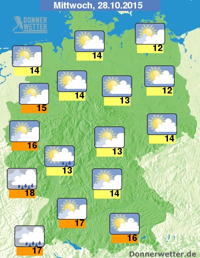 Am Mittwoch ist es zunächst verbreitet noch locker bewölkt, im Südwesten und Westen ist es jedoch auch teils schon stark bewölkt, aber weitgehend trocken. Im Tagesverlauf nehmen die Wolkenanteile vor allem im Süden und Westen des Landes zu, dabei ist im Südwesten gebietsweise Regen möglich, sonst bleibt es trocken. Die Temperatur steigt auf 12 Grad in Vorpommern und bis 18 Grad in Saarbrücken.