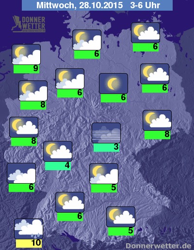 In der bevorstehenden Nacht bleibt der Himmel meist locker oder aufgelockert bewölkt, vor allem in der Mitte und im Osten des Landes zeigt sich gebietsweise ein sternenklarer Nachthimmel. Im Südwesten werden die Wolken zunehmend dichter und gegen Morgen ist hier und da auch etwas Regen möglich, sonst bleibt es jedoch trocken. Die Tiefstwerte liegen bei 10 Grad in Freiburg und bis 3 Grad im Eichsfeld.