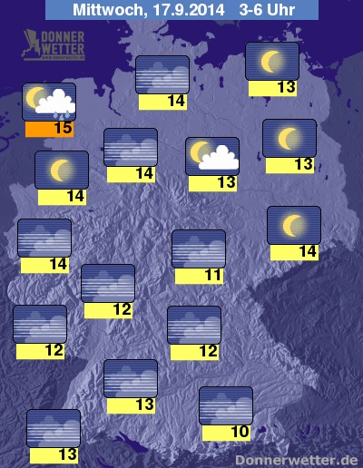 In der kommenden Nacht bleibt der Himmel häufig sternenklar, gebietsweise, bevorzugt im Norden ziehen aber auch einige Wolken durch, dabei fällt aber nur an der ostfriesischen Küste möglicher Regen, sonst bleibt es trocken. Vor allem entlang der Flusstäler kann sich jedoch zum Teil dichter Nebel bilden. Die Temperatur sinkt auf 15 Grad in Ostfriesland und etwa 10 Grad im Allgäu.