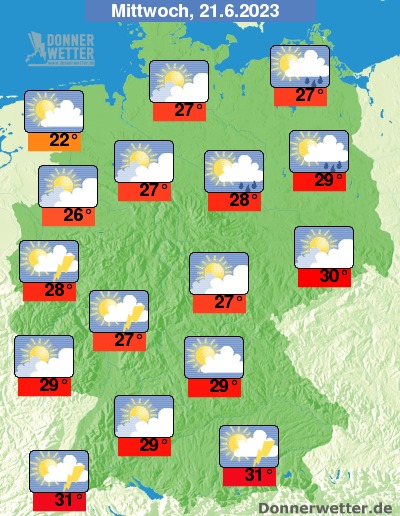 Am Mittwoch zeigt sich das Wetter zum Großteil heiter oder sonnig. Besonders in den westlichen Landesteilen und am Alpenrand bilden sich oft dichte Quellwolken und mögliche Schauer. Vereinzelt sind auch Gewitter möglich. Im übrigen Land bleibt es zumeist trocken. Die Temperatur erreicht 22 Grad an der Nordsee und bis 31 Grad am Oberrhein.