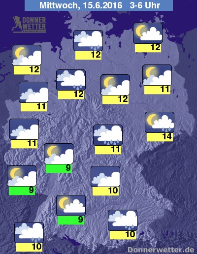 In der Nacht zum Mittwoch klingen die Niederschläge über dem Bundesgebiet größtenteils ab. Oft dicht bewölkt bei zeitweiligen Regenfällen bleibt es indes über dem Süden des Landes, sowie über Thüringen und Sachsen. Über den Norden ziehen ebenfalls teils dichte Wolken und es fällt gebietsweise Regen, sonst bleibt es im Nachtverlauf bei überwiegend aufgelockerter, teils starker Bewölkung meist trocken. Die Temperatur sinkt auf 14 Grad in Dresden und 9 Grad im Bliesgau.