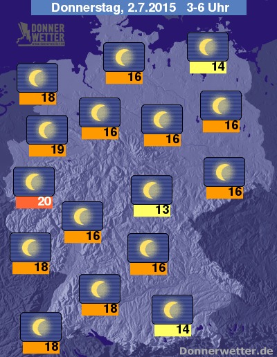 In der kommenden Nacht bleibt der Himmel weiterhin sternenklar und auch Regen ist natürlich keiner zu erwarten. Für Köln könnte es die erste Tropennacht mit Tiefstwerten bei 20 Grad C werden, ansonsten werden 19 Grad in Osnabrück und kühlere 13 Grad am Thüringer Wald erreicht.
