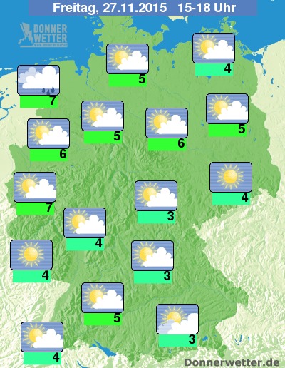 Heute Nachmittag ist es über Deutschland überwiegend locker, teils auch aufgelockert bewölkt, vor allem über der Südosthälfte ist es auch gebietsweise sonnig, dazu bleibt es vorerst überall trocken. Gegen frühen Abend kommen im Nordwesten und später auch im Westen dichte Wolken und zeitweiliger Regen auf, sonst bleibt es aber trocken. Die Temperatur steigt auf 3 Grad in München und bis 7 Grad im Rheinland.