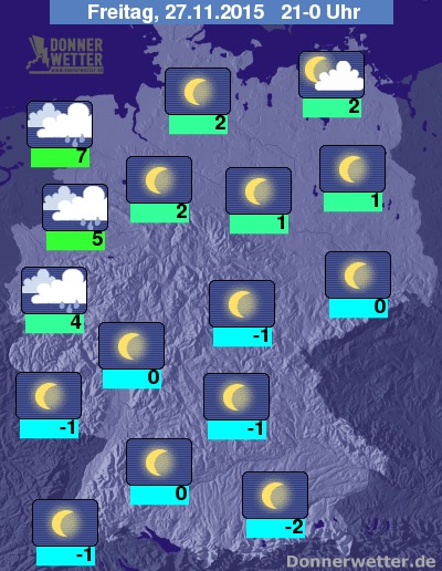 Heute Abend ziehen über den Nordwesten und Westen dichte Wolken mit zeitweiligem Regen auf, im großen Rest der Republik zeigt sich der Himmel dagegen weitgehend sternenklar und nur selten ziehen mal lockere Wolken durch, dabei bleibt es natürlich trocken. Die Abendtemperatur liegt bei recht milden 7 Grad im nördlichen Emsland und etwa -2 Grad in Augsburg.