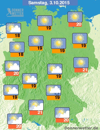 Am heutigen Tag der Deutschen Einheit zeigt sich vor allem über der Nordhälfte noch ein oft wolkenloser Himmel. Im Süden und im Tagesverlauf auch in der breiten Landesmitte ziehen jedoch teils dichtere Wolken auf, die jedoch nur selten etwas Regen bringen, sonst scheint zwischen den Wolken aber auch immer wieder die Sonne. Die Temperatur steigt auf 18 Grad im Münsterland und bis etwa 21 Grad im Kraichgau.