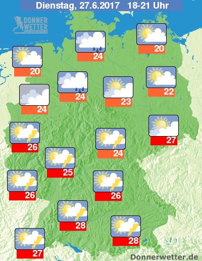 Im großen Rest der Republik ziehen oft dichte Wolken durch, die sowohl Schauer als auch einzelne Gewitter mit sich bringen, dazwischen zeigen sich jedoch auch Auflockerungen. Die Temperatur liegt bei 20 an der Nord- und Ostsee und bis 28 Grad im Raum München. Achtung Gewitter im Südwesten.