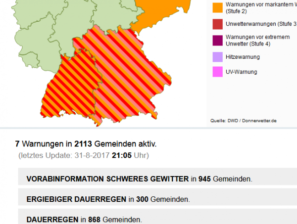 Im Süden an den Alpen Dauerregen. Unwetterwarnungen sind aktiv: