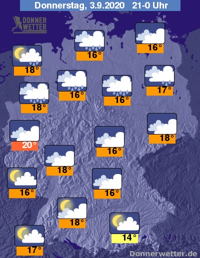 Bis Mitternacht regnet es in Teilen Norddeutschlands munter weiter. Auch in der Mitte verdichtet sich die Wolkendecke, es bleibt jedoch trocken. Im Süden und Südwesten kann man Mond und Sterne erkennen, oft aber verschwommen.