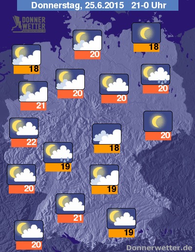 Heute Abend ziehen im Norden gebietsweise dichte Wolken durch, die den ein oder anderen Schauer mit sich bringen können. Im übrigen Bundesgebiet ist es hingegen meist locker oder aufgelockert bewölkt und weitgehend trocken, nur selten bilden sich vereinzelte Schauer. Oft sternenklar wird es vor allem in Sachsen, aber auch in Bayern. Die Abendtemperatur liegt bei 22 Grad in Aachen und etwa 18 Grad in Greifswald.