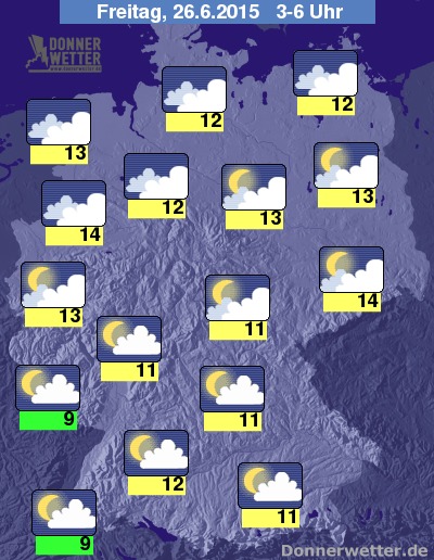 In der Nacht zum Freitag ist es über der Südhälfte Deutschlands meist locker oder aufgelockert bewölkt, nach Norden hin ist es hingegen verbreitet stark und zum Teil auch aufgelockert bewölkt, jedoch bleibt es überall trocken. Die Temperatur sinkt auf 14 Grad im Ruhrgebiet und bis 9 Grad am Fuße des Schwarzwaldes.