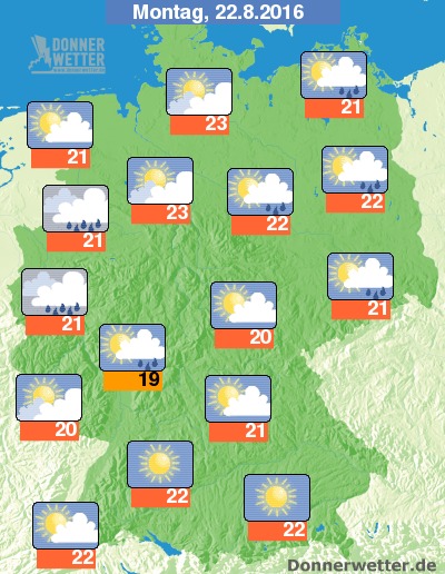 Am Dienstag ziehen vor allem vormittags im Norden noch teils dichte Wolken durch, die hier aber nur selten etwas Regen bringen können, sonst zeigt sich die Bundesrepublik verbreitet heiter oder sonnig. Teils mehr Wolken sind über der Mitte des Landes und im Südosten unterwegs, dazu bleibt es jedoch voraussichtlich trocken. Die Temperatur erreicht 22 bis 27 Grad.