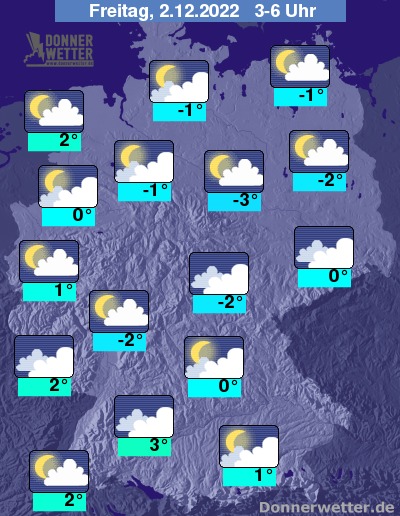 In der bevorstehenden Nacht bleibt es vor allem über der Südhälfte Deutschlands zumeist bedeckt mit nur seltenen Auflockerungen. Besonders über dem Norden können sich aber auch häufiger die Sterne zeigen, teils ist es aber auch hier stark bewölkt. Stellenweise bildet sich Nebel. Es bleibt landesweit trocken bei Tiefstwerten von 2 Grad entlang des Rheins und bis -3 Grad in der Magdeburger Börde.