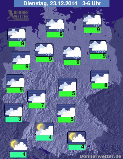 In der folgenden Nacht fällt im Norden unter einer dichten Bewölkung weiterhin zeitweise Regen, in der Mitte des Landes bleibt es stark bis dicht bewölkt, hier fällt aber seltener Regen. Komplett trocken mit einzelnen Auflockerungen ist es dagegen im Süden Deutschlands. Vor allem im Norden, aber auch in der Mitte Deutschlands weht ein frischer und teils starker, an der See und in einzelnen Böen auch stürmischer Wind. Die Temperatur sinkt auf 9 Grad entlang der Elbe und bis 3 Grad im Saargau.