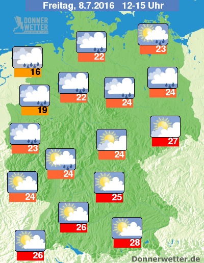 Die Temperaturen erreichen Werte um 16 Grad C in Ostfriesland und um 28 Grad C im Alpenvorland.