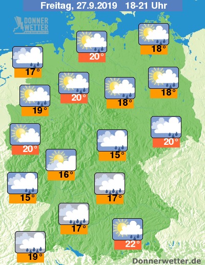 Am Abend regnet es in einem Streifen vom Oberrhein bis nach Sachsen. Auch südlich der Donau können teilweise Regen- oder Schauerwolken aufziehen. Im übrigen Land wechseln sich kurze freundliche Abschnitte mit Schauerwolken ab. Vereinzelt kann es auch blitzen und donnern. Im Rhein-Main-Gebiet und im Westen kann man die untergehende Sonne am ehesten beobachten.