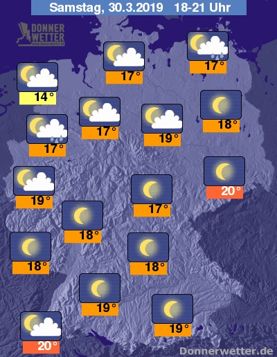 Heute Abend ist es überwiegend sternenklar, hier und da können ein paar Wolken durchziehen. Über dem Norden und Nordwesten ziehen teils auch dichte Wolken auf, die auch einzelne Schauer bringen können. Im übrigen Land bleibt es trocken bei anfänglichen Höchstwerten von 14 Grad in Cuxhaven und bis 20 Grad in Dresden.