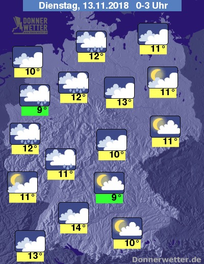 In der Nacht sowie in den frühen Morgenstunden dominiert im Land eine geschlossene Wolkendecke, in der gesamten Westhälfte sowie an den Küsten kann es zudem teils auch kräftiger regnen. Einzelne Wolkenlücken zeigen sich meist nur im äußersten Südosten Deutschlands.