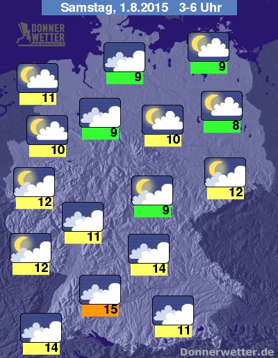 In der folgenden Nacht zeigt sich der Himmel zumeist aufgelockert bewölkt, besonders im Süden von Deutschland ist es aber oft auch dicht bewölkt, dazu bleibt es aber weitgehend trocken. Im Nordwesten und Nordosten der Republik bleibt es bei oft lockerer Bewölkung trocken. Die Temperatur sinkt auf 15 Grad in Stuttgart und bis etwa 8 Grad im nördlichen Brandenburg.