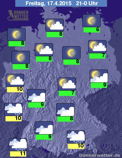 Heute Abend bleibt es im Süden noch weitgehend dicht bewölkt, jedoch zieht sich der Regen mehr und mehr zum Alpenrand hin zurück. In der breiten Mitte des Landes ist es teils leicht, teils locker bewölkt und trocken. Noch weiter nach Norden hin zeigt sich der Himmel häufig sternenklar oder es ziehen nur lockere Wolkenfelder durch, dabei bleibt es ebenso trocken. Die Abendtemperatur liegt bei 11 Grad im Breisgau und etwa 7 Grad im Grabfeld.