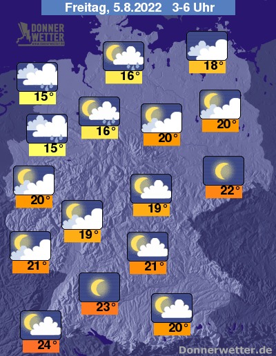 In der Nacht zum Freitag ist es über dem Süden Deutschlands und über Sachsen meist sternenklar, gegen Morgen nimmt hier die Bewölkung etwas zu, dabei bleibt es trocken. Im übrigen Land ziehen von Nordwesten her oft viele und teils dichte Wolken durch und es können sich vom Westen, über den Nordwesten bis in den Norden gebietsweise Schauer, örtlich auch Gewitter bilden. Im übrigen Land ist es aufgelockert bis stark bewölkt und dazu weitgehend trocken. Die Temperatur sinkt auf sehr warme 24 Grad in Freiburg und bis 15 Grad in Meppen.