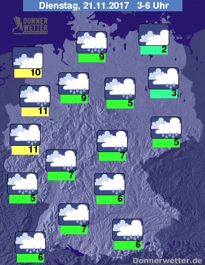 In der Nacht bleibt der Himmel weiterhin bedeckt und es fällt immer wieder Regen. Die Temperatur sinkt auf 11 Grad in Köln und bis 2 Grad in Vorpommern.
