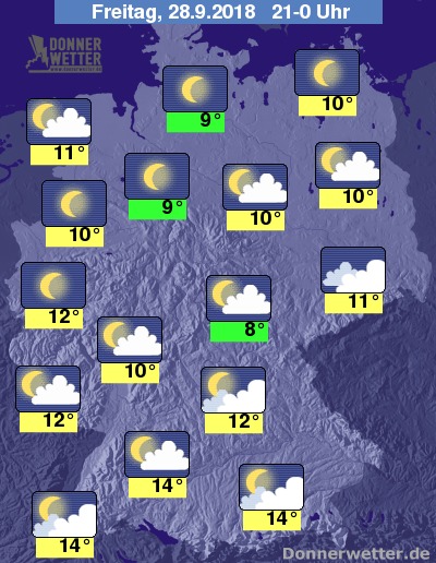 Am frühen Abend bleibt es ganz im Süden noch freundlich bei angenehmen Temperaturen von 18 bis 22 Grad. Im Norden und in der Mitte wechseln sich dichtere Wolkenfelder mit einigen Aufheiterungen ab und es sollte überwiegend trocken bleiben. Ganz im Norden lässt sich die Abendsonne noch häufiger blicken. Die Temperaturen liegen meist zwischen 12 bis 17 Grad.