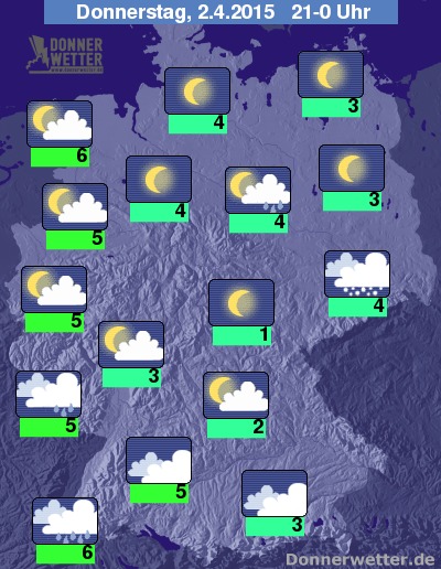 Heute Nachmittag halten sich insbesonders im Süden des Landes weitgehend dichte Wolken, dazu fällt häufig Regen, teils auch Schneeregen oder Schnee. Auch weiter nach Norden hin ist es oft noch stark bewölkt und es bilden sich einzelne, teils kräftige Regen-, Schneeregen- oder Schneeschauer, gebietsweise kann die Bewölkung aber auch auflockern und der Sonne Platz machen. Die Temperatur liegt bei 4 Grad im Grabfeld und 9 Grad im Rheinland. Der Wind weht frisch, teils auch noch stark, dabei sind stürmische Böen, am Alpenrand, an der See und auf den Bergen sind anfangs noch Sturmböen möglich.