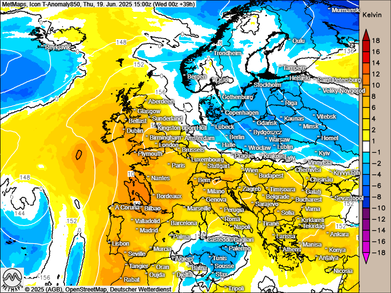 Die Karte zeigt die Temperaturanomalie nach ICON am Donnerstagnachmittag (15 Uhr).