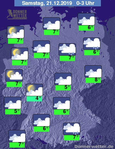 In der Nacht zeigt sich der Himmel über der Süd- und Osthälfte des Landes überwiegend stark bewölklt oder bedeckt und vor allem entlang der Oder sowie im Südosten muss zeitweise mit Schauern gerechnet werden. Im Westen und später auch im Norden Deutschlands ist es meist locker oder aufgelockert bewölkt und es bleibt trocken.
