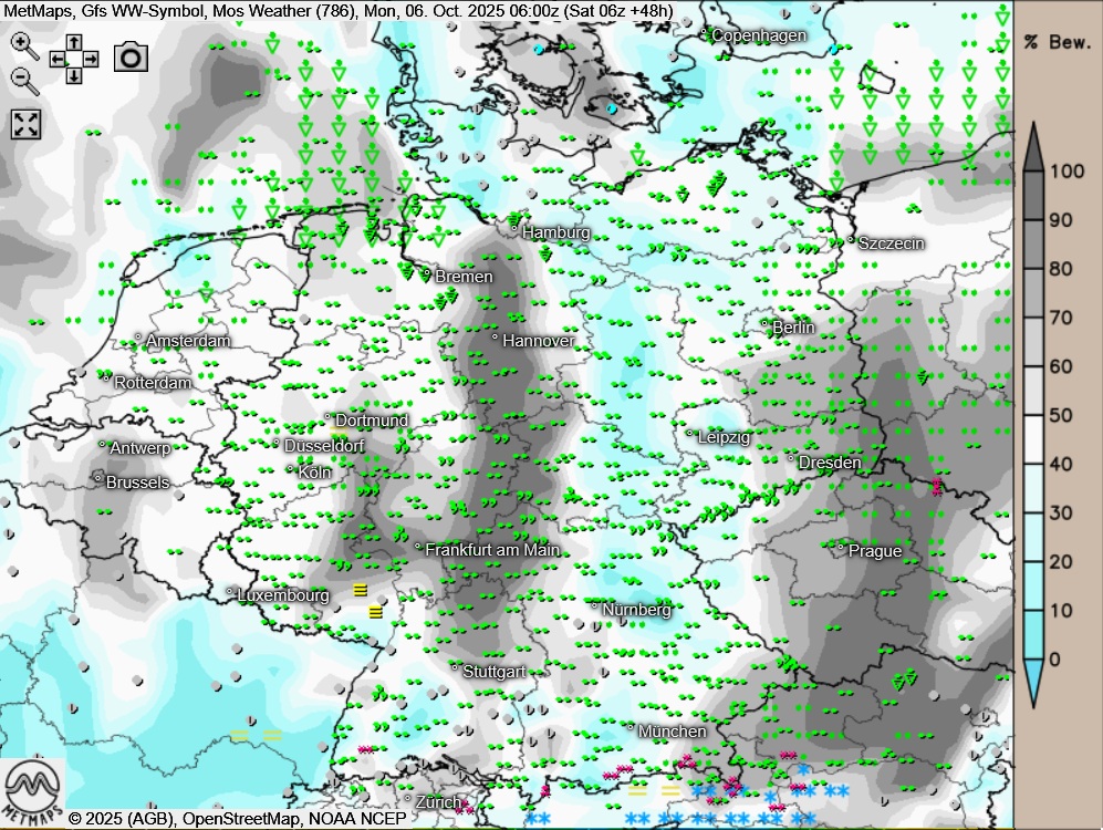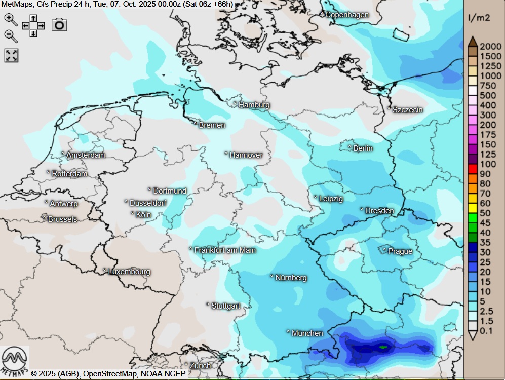 Die Wetter- und Temperaturkarte für Montagmorgen (06:00 Uhr) sowie die 24-Stunden-Regenmengen am Montag nach GFS:
