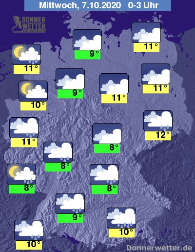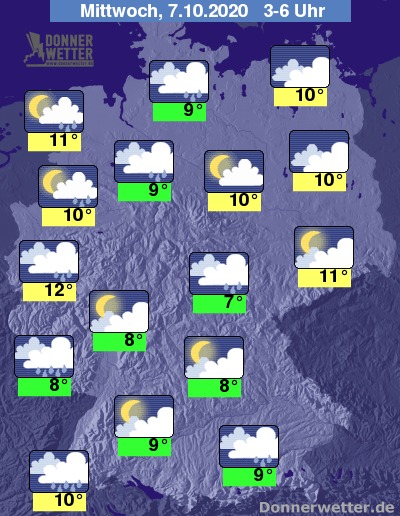 Während der zweiten Nachthälfte trocknet die Luft zunächst öfters mal ab und die Wolkendecke reißt stellenweise auf, bevor von Westen neuer Regen heranzieht.