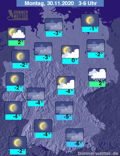 In der kommenden Nacht ist der Himmel häufig sternenklar, im Osten können dichte Wolken hier und da ein paar Flocken oder Tropfen bringen. Stellenweise bildet sich auch Nebel, dazu bleibt es trocken. Die Temperatur sinkt auf 2 Grad in der Lausitz und bis -6 Grad in Oberbayern.