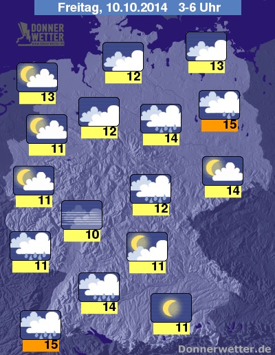 In der kommenden Nacht zieht das Regenband langsam südostwärts. Es erreicht bis zum Morgen etwa eine Linie vom Schwarzwald, dem Erzgebirge bis ins südliche Brandenburg. Sonst bleibt die Bewölkung vor allem nach Südosten hin, aber auch im Nordwesten meist aufgelockert, nach Westen hin halten sich dichtere Wolken, aber hierbei bleibt es weitgehend trocken. Jedoch bildet sich stellenweise Nebel oder Dunst. Die Temperatur sinkt auf 15 Grad in Berlin und etwa 10 Grad rund ums Sauerland.