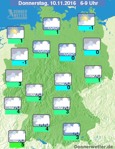 Die Höchsttemperatur liegt um 5 Grad C im Schwarzwald und minus 1 Grad C im Münsterland.