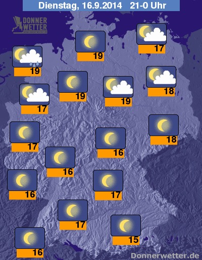 Am heutigen Abend zeigt sich der Himmel von der breiten Mitte bis nach Süddeutschland verbreitet sternenklar, auch im Norden ist es gebietsweise klar, zeitweise ziehen hier aber auch einige Wolken durch, für mögliche Schauer reicht es voraussichtlich nur an der ostfriesischen Küste. Die Temperatur liegt am Abend noch bei 19 Grad in Hamburg und 15 Grad in Oberbayern.
