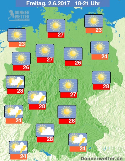 Während die Sonne in der Nordhälfte fast ungestört vom Himmel lacht, bilden sich im Süden in schwül-warmer Luft bereits über Mittag erste Quellwolken. Zwischen Pfalz und Schwarzwald sowie am Alpenrand kann es bereits dann zum ersten Mal krachen.